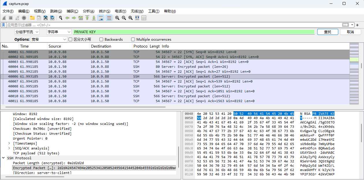 分组字节流查找关键字符串 PRIVATE KEY 得到私钥传输记录 ip为 10.0.1.50