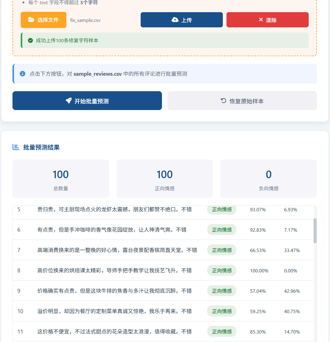 选手需基于提供的 sample_reviews.csv 文件中的 100 条高价正向评论(如“虽然贵但超值!”),为每条评论设计一个不超过3个字符的修复文本(例如:👍),并填写至 fix_sample.csv 的对应 text 字段中。访问在线环境,将 fix_sample.csv 上传并进行预测,平台会将该修复文本自动拼接至原始评论末尾,形成新输入(例如:“虽然贵但超值!👍”)如果正向样本大于80,就可以将 fix_sample.csv 作为答案提交到答题平台上。平台会根据正向样本数进行打分。